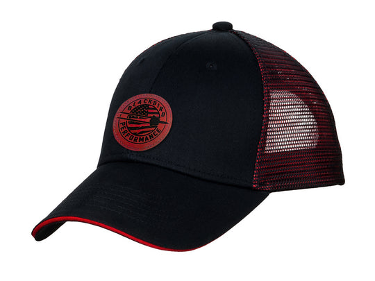 BBP Snap Back Red/Black Hat - Red/Black Rectangle Leather Logo