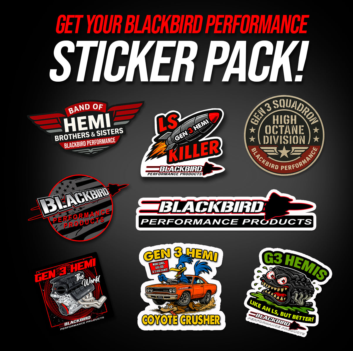 Our Blackbird Performance Sticker Pack delivers 8 killer designs celebrating everything we love about the Gen 3 Hemi world.